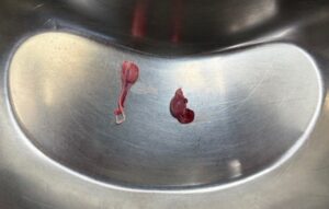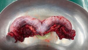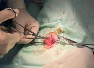 開腹してすぐに拡大子宮を確認したのですが、胸の奥行きが深いタイプの犬種で子宮も固く張っていたので摘出するのにかなり手こずりました。結局2人がかりで子宮を取り出して、切り離して膿盆に置いたとたんに膿が出てきました。危ない所でした…。